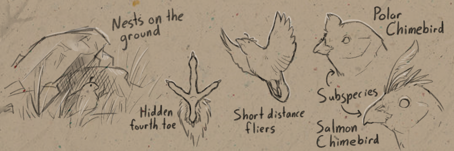 Naturally found across much of the Atalavian mainland, chimebirds live in tight-knit family units consisting of a breeding pair and their offspring. Rarely straying far from one another, they move like a tide - small ripples of fluff and feathers chittering through the underbrush. These family groups can range from anywhere from 3 adults with offspring to 10 adults with combined offspring. Family photos can get a bit challenging.