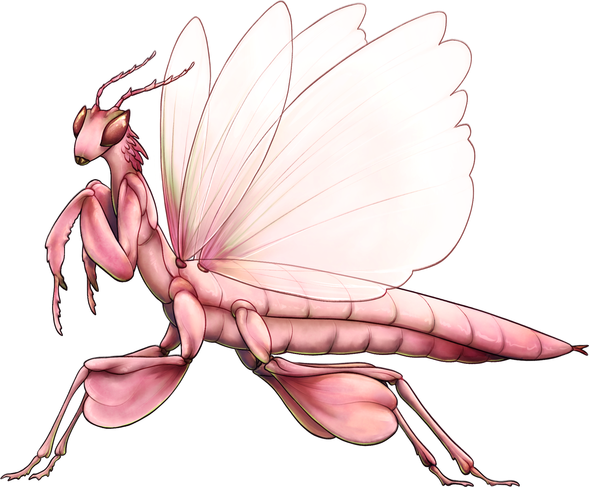 Thornates are solitary and territorial. They maintain vertical hunting grounds within flowering foliage. Plants with the biggest and smelliest blooms are hot territory ripe with fighting. While not social, they engage in striking mating rituals where both sexes flash their wings in rhythmic “flower-duels,” displaying color and motion meant to overwhelm and entice. The sound of their wings and limbs flapping resembles that of a flock of birds leaving frantically. So what may sound like a concerning scurry could very well be some frisky mantises!