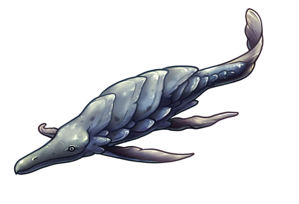 Its body is compact but powerful, covered in dense interlocking scales that resemble natural armor plates. They are rough to the touch and often chipped through age. Bankrunners are commonly colored a sandy beige, green-grey, or river-blue according to the local sediment. Dark speckling on the back and flanks adds additional camouflage under dappled lighting. Whereas its salmonid ancestors had a dorsal fin, the Bankrunner lacks this aspect - and in turn, its momentum and agility are regulated by a long, muscular tail and long side fins. Its hooked beak and low-set small eyes are built to root through gravel beds or scoop up insects and crustaceans from tight crevices.