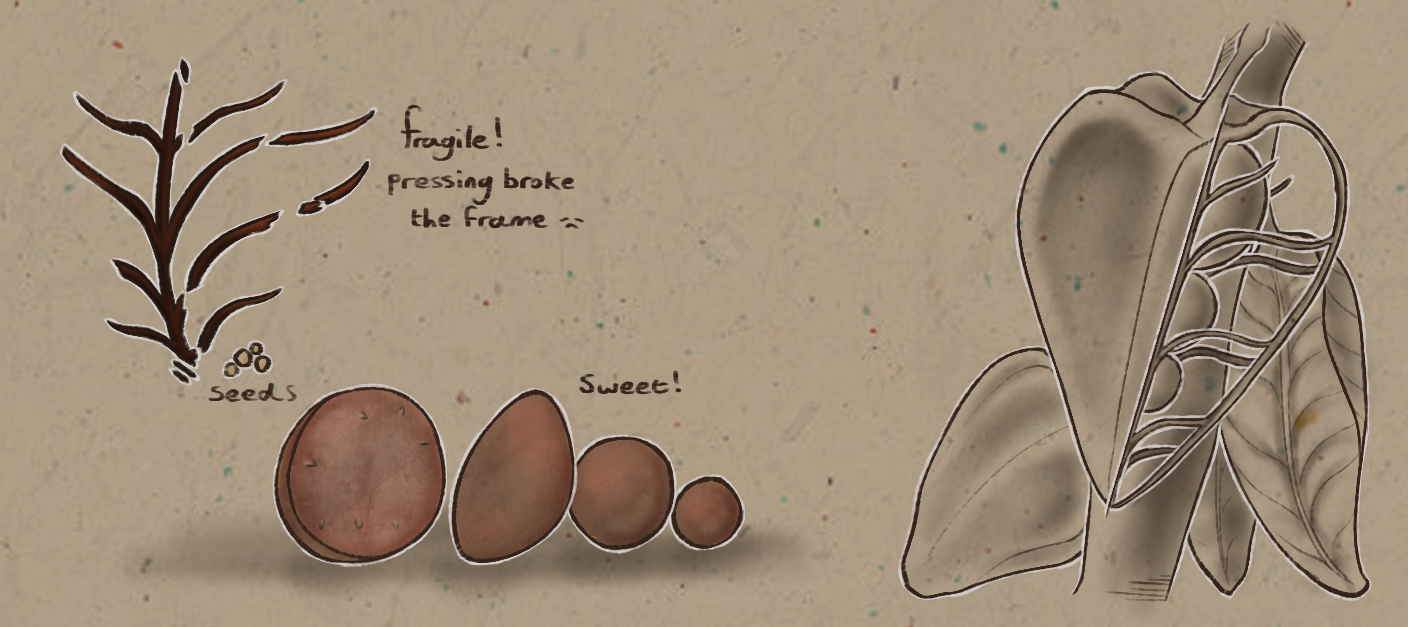 These berries glow like burning lanterns when night falls on X-rich landscapes. Though it is able to be cultivated on specialty Veritam farms, it’s surprisingly resilient in the wild despite its picky nature in domestic care. The fruits are sweet but delicate, often used in teas or desserts. The outer husk dries to a papery shell, occasionally used in decorative garlands.