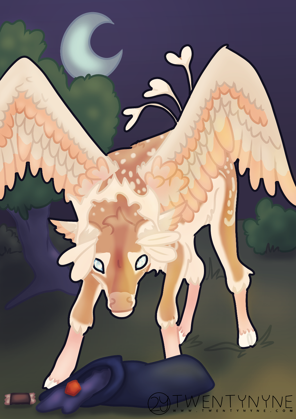 Blithe, the quadruped bowing down to grab her spilled candy, dressed in wings and a small feather head decor outside with the moon in a crecent