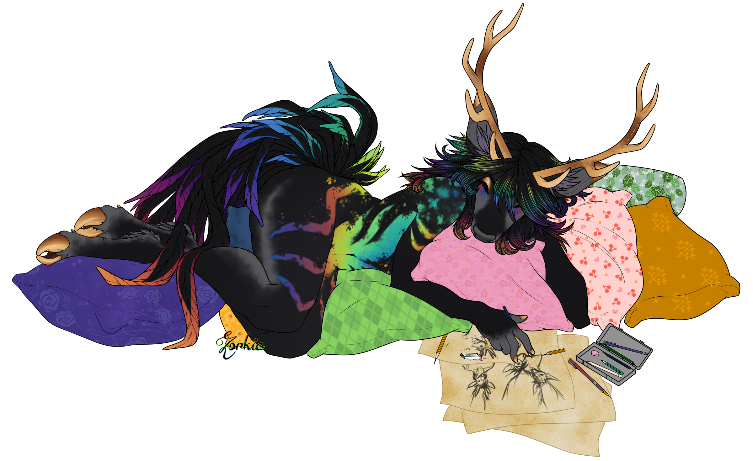 Everybody know Prisma’s language consists of shapes on paper and strokes of the brush; it stands to reason her love shines best in her art, too! Sometimes, expressing oneself is utterly exhausting, though… and Prisma often falls asleep when she’s been overwhelmed by her artistic expression. Here, Prisma is doodling for some unnamed Faun, and has fallen victim to that weariness - surely she’s dreaming of the recipient!