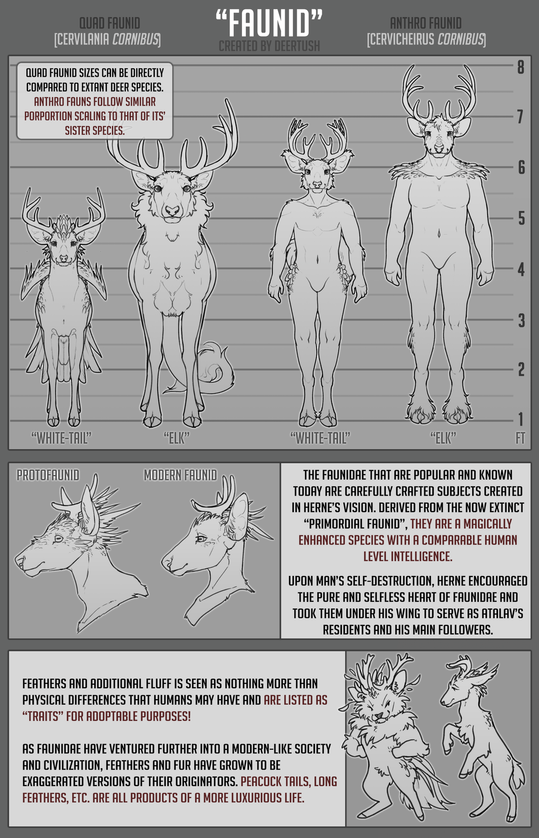 Standard conformation of a Faunidate consists of an anthropomorphic deer with feathers. Occasionally, a Faunid will have a mutation that breaks from the standard conformation and traits. Considered the original Faunidae subspecies, some individuals claim they were made in Herne's vision.